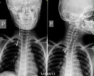 A branchial cleft cyst is a cyst as a swelling in the upper part of neck anterior to sternocleidomastoid. It can, but does not necessarily, have an opening to the skin surface, called a fistula. The cause is usually a developmental abnormality arising in the early prenatal period, typically failure of obliteration of the second, third, and fourth branchial cleft, i.e. failure of fusion of the second branchial arches and epicardial ridge in lower part of the neck. Branchial cleft cysts account for almost 20% of neck masses in children.[1] Less commonly, the cysts can develop from the first, third, or fourth clefts, and their location and the location of associated fistulas differs accordingly.