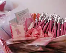 Thousands of breast cancer-themed products are developed and sold each year.[17] Some of these items are everyday products that have been repackaged or repositioned to take advantage of cause-related marketing, such as teddy bears, clothing, jewelry, candles, and coffee mugs.[14] These blended value objects offer consumers an opportunity to simultaneously buy an object and make a donation to a breast cancer organization.[14] Some of these products are produced and/or sold by breast cancer survivors or charities for fundraising purposes, while others are for profits in addition to fundraising. Manufacturers also produce products with pink labels or pink ribbon logos to donate a sum of money to support the cause.[18] The donation is typically capped so that it is reached after a fixed level of sales, although in some cases the company is providing only free advertising for a selected charity. Although advertising costs are rarely disclosed, some companies have been found to spend far more money advertising "pink products" and tie-ins than they donate to charitable organizations supporting research or patients. For example, in 2005, 3M spent US$500,000 advertising post-it notes printed with a pink ribbon logo. Sales were nearly double what the company expected, but the campaign resulted in a $300,000 donation.[18]