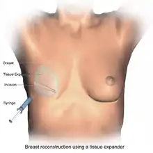 Typically, at the time of the mastectomy, the surgeon will insert a tissue expander underneath the pectoralis major muscle of the chest wall.[5][6] This temporary silastic implant is used to hold tension on the mastectomy flaps. In doing so, the tissue expander prevents the breast tissue from contracting and allows for use of a larger implant later on compared to what would be safe at the time of the mastectomy.[3] Following this initial procedure, the patient must return to the clinic on multiple occasions for saline to be injected into a tube inside the tissue expander. By doing this slowly over the course of several weeks, the space beneath the pectoralis major muscle is safely expanded to an appropriate size without causing too much stress on the breast tissue. A second procedure is then necessary to remove the tissue expander and replace it with the final, permanent prosthetic implant.[7]