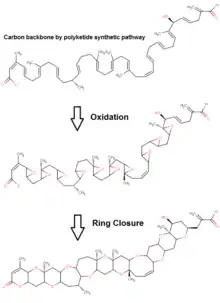 Brevetoxins share the common backbone structure of polyketides, but there are several methyl and oxygen groups that are not typical of a traditional polyketide synthesis. Labelling studies identifying the origin of the various carbon atoms have shown that the biosynthesis of brevetoxins greatly deviates from the polyketide synthetic pathway.