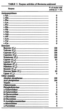 Brevinema andersonii can be readily identified by enzyme analysis and SDS-PAGE, or fatty acid composition data. An enzyme analysis of B. andersonii showed activity with butyrate, valerate, caproate, caprylate, nonanoate, caprate, esterase lipase, alkaline phosphatase, acid phosphatase, and β-glucuronidase.[1] The fatty acid composition mainly consists of myristic acid (14:0), palmitic acid (16:0), and oleic acid (18:l), and smaller amounts of stearic acid (18:1) and linoleic acid (18:2).[1] There were low levels, less than 1%, of other fatty acids detected. B. andersonii was found to be catalase negative.[1]