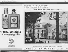 The company's origins date back to 1880 when Achille Antonio Brioschi (1860–1942), who had served as an apprentice at various manufacturers of chemical-pharmaceutical products and eau de Colognes, began the small-scale production of the so-called effervescente Brioschi: a powder which, when dissolved in water, produced a refreshing drink.[2] It was not a medicine, nor was it marketed as one, although the idea for it derived from effervescent products based on magnesium citrate that had originated in the United Kingdom.[2] The business grew and the product found various export markets of which the first was Brazil. Subsidiaries were established in the United States in 1894 and in the Swiss Canton Ticino in 1897.[2] In 1907 the business was transformed into the company Achille Brioschi & C.[1] The popular analgesic cachet Brioschi, based on the kalmine of Paul Métadier of Tours, was introduced in 1911; other product lines included Lysoform-based disinfectants, the Johann Maria Farina eau de Cologne, and anti-malarial drugs.[2] In 1914 the company was quoted on the Milan stock exchange.[1]