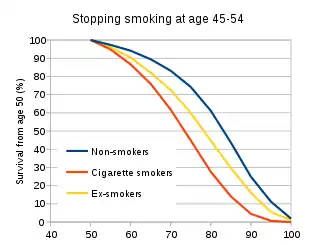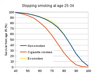 In the follow-up reports, published every ten years, more information became available. A major conclusion of the study is, for example, that smoking decreases life span up to 10 years, and that more than 50% of all smokers die of a disease known to be smoking-related, although the excess mortality depends on amount of smoking, specifically, on average, those who smoke until age 30 have no excess mortality, those who smoke until age 40 lose 1 year, those who smoke until 50 lose 4 years, and those who smoke until age 60 lose 7 years.[1]
