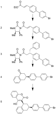 Brodifacoum is a derivative of the 4-hydroxy-coumarin group. Compound 1 is the starting ester needed to synthesize brodifacoum. To obtain this starting compound, a simple Wittig condensation of ethyl chloroacetate with 4’-bromobiphenylcarboxaldehyde is accomplished. Compound 1 is transformed into 2 by consecutive hydrolysis, halogenation to form an acid chloride, and then reacted with the required lithium anion. This is done using KOH and EtOH for hydrolysis, and then adding SOCl2 for chlorination to form the acid chloride which reacts with the addition of lithium anion. Compound 2 is then transformed using organocopper chemistry to yield compound 3 with good stereoselectivity of about 98%. Typically, a Friedel-Crafts type cyclization would then be used to obtain the two-ring system portion of compound 4, but this results in low yield. Instead, trifluoromethanesulfonic acid in dry benzene catalyzes the cyclization with good yield. The ketone is then reduced with sodium borohydride yielding a benzyl alcohol. Condensation with 4-hydroxycoumarin under HCl yields compound 5, brodifacoum.[4]