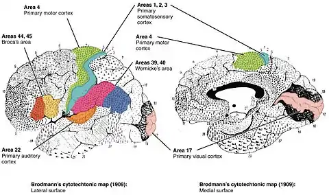 Brodmann areas were originally defined and numbered by the German anatomist Korbinian Brodmann based on the cytoarchitectural organization of neurons he observed in the cerebral cortex using the Nissl method of cell staining. Brodmann published his maps of cortical areas in humans, monkeys, and other species in 1909,[1] along with many other findings and observations regarding the general cell types and laminar organization of the mammalian cortex. The same Brodmann area number in different species does not necessarily indicate homologous areas.[2] A similar, but more detailed cortical map was published by Constantin von Economo and Georg N. Koskinas in 1925.[3]