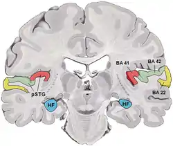 ![]() Coronal section of the human brain. BA22 is shown in yellow. | |