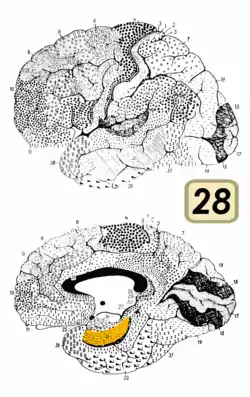 Brodmann area 28 is a subdivision of the cerebral cortex defined on the basis of cytoarchitecture. It is located on the medial aspect of the temporal lobe and is part of the entorhinal cortex (Brodmann-1909).