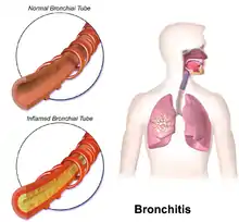 Bronchitis is inflammation of the bronchi (large and medium-sized airways) in the lungs that causes coughing.[1] Symptoms include coughing up sputum, wheezing, shortness of breath, and chest pain.[1] Bronchitis can be acute or chronic.[1]