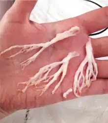 Plastic bronchitis is a rarely found condition in which thickened secretions plug the bronchi.[75][76] The plugs are rubbery or plastic-feeling (thus the name). The light-colored plugs take the branching shape of the bronchi that they fill, and are known as bronchial casts.[75] When these casts are coughed up, they are firmer in texture from typical phlegm or the short, softer mucus plugs seen in some people with asthma.[75] However, some people with asthma have larger, firmer, more complex plugs. These differ from the casts seen in people whose plastic bronchitis is associated with congenital heart disease or lymphatic vessel abnormalities mainly because eosinophils and Charcot–Leyden crystals are present in the asthma-associated casts but not in the others.[75]