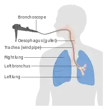A flexible bronchoscope is inserted with the patient in a sitting or supine position. Once the bronchoscope is inserted into the upper airway, the vocal cords are inspected. The instrument is advanced to the trachea and further down into the bronchial system and each area is inspected as the bronchoscope passes. If an abnormality is discovered, it may be sampled using a brush, a needle, or forceps. Specimen of lung tissue (transbronchial biopsy) may be sampled using a real-time x-ray (fluoroscopy) or an electromagnetic tracking system.[9] Flexible bronchoscopy can also be performed on intubated patients, such as patients in intensive care. In this case, the instrument is inserted through an adapter connected to the tracheal tube.