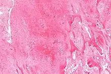 Brown tumours consist of fibrous tissue, woven bone and supporting vasculature, but no matrix. The osteoclasts consume the trabecular bone that osteoblasts lay down and this front of reparative bone deposition followed by additional resorption can expand beyond the usual shape of the bone, involving the periosteum thus causing bone pain. The characteristic brown coloration results from hemosiderin deposition into the osteolytic cysts. Hemosiderin deposition is not a distinctive feature of brown tumors; it may also be seen in giant cell tumors of the bone.[2][3]
