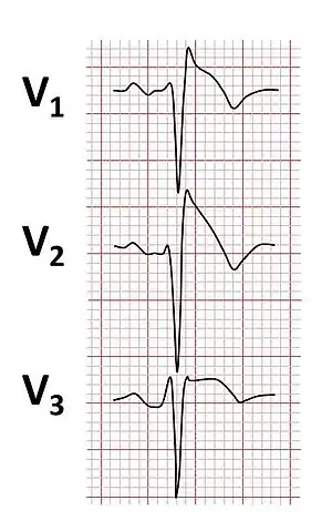 Brugada syndrome is diagnosed by identifying characteristic patterns on an electrocardiogram.[12] The pattern seen on the ECG includes ST elevation in leads V1-V3 with a right bundle branch block (RBBB) appearance. There may be evidence of a slowing of electrical conduction within the heart, as shown by a prolonged PR interval. These patterns may be present all the time, but may appear only in response to particular drugs (see below), when the person has a fever, during exercise, or as a result of other triggers. The ECG pattern may become more obvious by performing an ECG in which some of the electrodes are placed in different positions from usual, specifically by placing leads V1 and V2 higher up the chest wall in the 1st or 2nd intercostal spaces.[22]