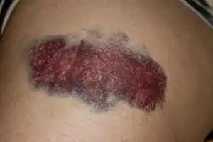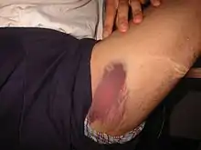 A bruise, also known as a contusion, is a type of hematoma of tissue,[3] the most common cause being capillaries damaged by trauma, causing localized bleeding that extravasates into the surrounding interstitial tissues. Most bruises are not very deep under the skin so that the bleeding causes a visible discoloration. The bruise then remains visible until the blood is either absorbed by tissues or cleared by immune system action. Bruises, which do not blanch under pressure, can involve capillaries at the level of skin, subcutaneous tissue, muscle, or bone.[4][5] Bruises are not to be confused with other similar-looking lesions. These lesions include petechia (< 3 mm result from numerous and diverse etiologies such as adverse reactions from medications such as warfarin, straining, asphyxiation, platelet disorders and diseases such as cytomegalovirus),[6] purpura (3 mm to 1 cm, classified as palpable purpura or non-palpable purpura and indicates various pathologic conditions such as thrombocytopenia),[7] and ecchymosis (>1 cm caused by blood dissecting through tissue planes and settled in an area remote from the site of trauma or pathology such as periorbital ecchymosis, e.g.,"raccoon eyes", arising from a basilar skull fracture or from a neuroblastoma).[8]