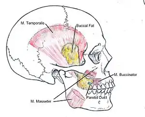 The buccal fat pad (also called Bichat’s fat pad, after Xavier Bichat, and the buccal pad of fat), is one of several encapsulated fat masses in the cheek. It is a deep fat pad located on either side of the face between the buccinator muscle and several more superficial muscles (including the masseter, the zygomaticus major, and the zygomaticus minor).[1] The inferior portion of the buccal fat pad is contained within the buccal space. It should not be confused with the malar fat pad, which is directly below the skin of the cheek.[2] It should also not be confused with jowl fat pads. It is implicated in the formation of hollow cheeks and the nasolabial fold, but not in the formation of jowls.[3]