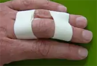 Buddy wrapping or buddy taping is the act of bandaging a damaged or particularly a fractured finger or toe together with a healthy one. The bandage or medical tape is usually stiff, not allowing the digits to move; the healthy digit acts as a splint, keeping the damaged one in a natural position for healing. Rest plays a major role in the healing process. Buddy wrapping may also be used for sprains, dislocations, and other injuries.