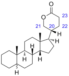 Bufadienolide is a chemical compound with steroid structure. Its derivatives are collectively known as bufadienolides, including many in the form of bufadienolide glycosides (bufadienolides that contain structural groups derived from sugars). These are a type of cardiac glycoside, the other being the cardenolide glycosides. Both bufadienolides and their glycosides are toxic; specifically, they can cause an atrioventricular block, bradycardia (slow heartbeat), ventricular tachycardia (a type of rapid heartbeat), and possibly lethal cardiac arrest.[1]