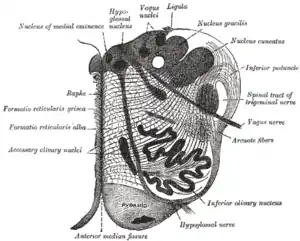 ![]() Section of the medulla oblongata at about the middle of the olivary body | |