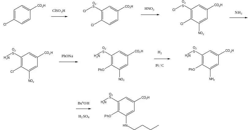 Bumetanide, 3-butylamino-4-phenoxy-5-sulfamoylbenzoic acid, is synthesized from 4-chlorobenzoic acid. In the first stage of synthesis, it undergoes sulfonylchlorination by chlorosulfonic acid, forming 4-chloro-3-chlorosulfonylbenzoic acid, which is further nitrated with nitric acid to 4-chloro-3-chlorosulfonyl-5-nitrobenzoic acid. Reacting this with ammonia gives 5-aminosulfonyl-4-chloro-3-nitrobenzoic acid, which when reacted with sodium phenolate is transformed into 5-amino-sulfonyl-3-nitro-5-phenoxybenzoid acid. Reduction of the nitro group in this product by hydrogen using a palladium on carbon catalyst gives 3-amino-5-aminosulfonyl- 5-phenoxybenzoic acid. Finally, reacting this with butyl alcohol in the presence of sulfuric acid gives the desired bumetanide.