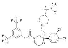 - Emonds-Alt X, Proietto V, Steinberg R, Oury-Donat F, Vigé X, Vilain P, et al. (December 2002). "SSR240600 [(R)-2-(1-[2-[4-[2-[3,5-bis(trifluoromethyl)phenyl]acetyl]-2-(3,4-dichlorophenyl)-2-morpholinyl]ethyl]- 4-piperidinyl)-2-methylpropanamide], a centrally active nonpeptide antagonist of the tachykinin neurokinin-1 receptor: I. biochemical and pharmacological characterization". The Journal of Pharmacology and Experimental Therapeutics. 303 (3): 1171–9. doi:10.1124/jpet.102.040162. PMID 12438541.