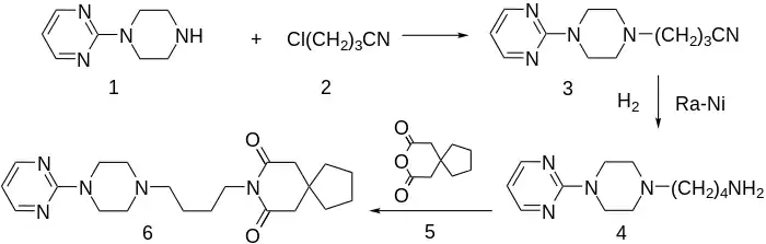 Alkylation of 1-(2-pyrimidyl)piperazine (1) with 3-chloro-1-cyanopropane (2, 4-chlorobutyronitrile) gives 3, which is reduced either by hydrogenation over Raney nickel catalyst, or with LAH. The resulting 1° amine (4) from the previous step is then reacted with 3,3-tetramethyleneglutaric anhydride (5, 8-Oxaspiro[4.5]decane-7,9-dione) in order to yield buspirone (6).