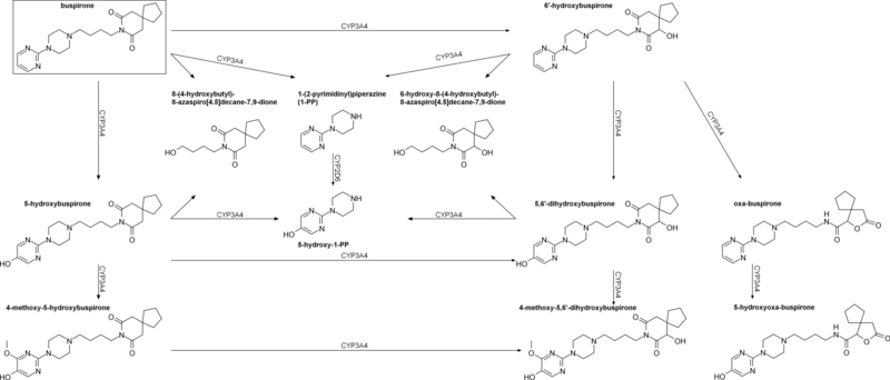 Buspirone has a low oral bioavailability of 3.9% relative to intravenous injection due to extensive first-pass metabolism.[2] The time to peak plasma levels following ingestion is 0.9 to 1.5 hours.[2] It is reported to have an elimination half-life of 2.8 hours,[2] although a review of 14 studies found that the mean terminal half-life ranged between 2 and 11 hours, and one study even reported a terminal half-life of 33 hours.[6] Buspirone is metabolized primarily by CYP3A4, and prominent drug interactions with inhibitors and inducers of this enzyme have been observed.[4][5] Major metabolites of buspirone include 5-hydroxybuspirone, 6-hydroxybuspirone, 8-hydroxybuspirone, and 1-PP.[6][7][8] 6-Hydroxybuspirone has been identified as the predominant hepatic metabolite of buspirone, with plasma levels that are 40-fold greater than those of buspirone after oral administration of buspirone to humans.[7] The metabolite is a high-affinity partial agonist of the 5-HT1A receptor (Ki = 25 nM) similarly to buspirone, and has demonstrated occupancy of the 5-HT1A receptor in vivo.[7] As such, it is likely to play an important role in the therapeutic effects of buspirone.[7] 1-PP has also been found to circulate at higher levels than those of buspirone itself and may similarly play a significant role in the clinical effects of buspirone.[46][48]