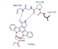 Initial attempts to identify ATP-competitive c-Met inhibitors in 2002 led to the discovery of K252a, a staurosporine-like inhibitor which blocks c-Met.[10][11] K252a was the first structure to be solved in complex with the unphosphorylated MET kinase domain. It forms two hydrogen bonds between the hinge and pyrralocarbazole subunit.[8]