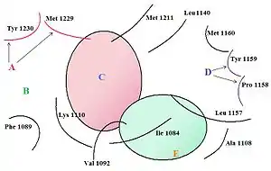 Figure 5. The topographical features of the Met ATP binding site. A: Tyrosine in the activation loop, B: Hydrophobic sub-pocket C: Central hydrophobic region, D: Hinge region, E: Hydrophobic sub-pocket.[16]