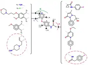 Series of quinoline c-Met inhibitors with an acylthiourea linkage have been explored. Multiple series of analogs have been found with alternative hinge binding groups (e.g. replacement of the quinoline group), replacement of the thiourea linkage (e.g. malonamide, oxalamide, pyrazolones) and constraining of the acyclic acylthiourea structure fragment with various aromatic heterocycles. Further refinement included the blocking of the p-position of the pendant phenyl ring with a fluorine atom.[12] Example of interactions between c-Met and a small molecules (marked in a red circle) of class II are as follows: The scaffold of c-Met lodges into the ATP pocket by three key hydrogen bonds, the terminal amine interacts with the ribose pocket (of ATP), the terminal 4-fluorophenyl group is oriented in a hydrophobic pocket and pyrrolotriazine plays the role of the hinge-binding group.[12]