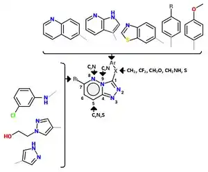 A series of triazolotriazines was discovered, which showed great promise as a c-MET inhibitors. Structure activity relationship (SAR) implies the necessity of an aryl group linked to the triazine ring and an appropriate hydrogen bond acceptor (e.g. hydroxyl group) attached to the pendant benzyl ring but it seems like the phenol acts as a hinge binder (with Met1160) and that the triazine interacts with Tyr1230.[12] A number of similar analogues were found and assayed. Structurally similar series of c-Met inhibitors in which a phenolic hinge binding element was linked to an arylamino-triazolopyridazine or aryl-triazolothiapyridazine. One-atom linker was more efficient than a two-atom linker and that substitution at the benzylic position seemed to be tolerated. Compounds with heterocyclic hinge binding elements (quinoline, pyridine, azaindole) linked to fused, nitrogen-dense heteroaromatics (triazolopyridazines, triazolopyrazines and triazolotriazines) have been described.[12] See figure 4 for details.[12]