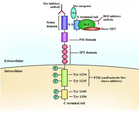 c-Met dysregulation can be due to overexpression, gene amplification, mutation, a ligand-dependent auto- or paracrine loop or an untimely activation of RTK.[10][13] All these factors affect the survival of cells, their proliferation and motility. They also lead to cancers and resistance to therapies which aim to treat them.[13] Patients with aberrant c-Met activity usually have a poor prognosis, aggressive disease, increased metastasis and shortened survival.[10] This is why targeting the HGF/c-MET signalling pathway has been untaken as a treatment for cancer,[10][13] and several different therapeutic approaches are being clinically tested. A variety of approaches have been used to target c-Met, each focusing on one of the serial steps that regulate c-Met activation by antibodies, peptide agonists,[4][10] decoy receptors and other biologic inhibitors[14] or small molecules inhibitors.[10]
