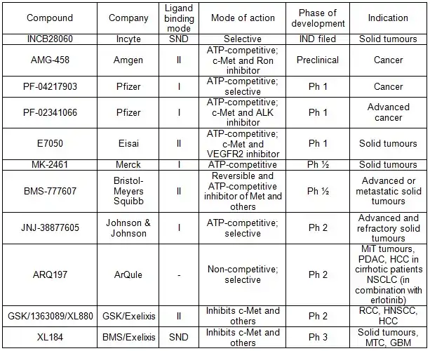 Table 1. Examples of small molecule c-Met inhibitors in clinical trials (2010).[12]