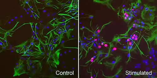 Expression of c-fos is an indirect marker of neuronal activity because c-fos is often expressed when neurons fire action potentials.[28][29] Upregulation of c-fos mRNA in a neuron indicates recent activity.[30]