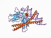 In the fields of molecular biology and genetics, c-Fos is a proto-oncogene that is the human homolog of the retroviral oncogene v-fos.[5] It was first discovered in rat fibroblasts as the transforming gene of the FBJ MSV (Finkel–Biskis–Jinkins murine osteogenic sarcoma virus) (Curran and Tech, 1982). It is a part of a bigger Fos family of transcription factors which includes c-Fos, FosB, Fra-1 and Fra-2.[6] It has been mapped to chromosome region 14q21→q31. c-Fos encodes a 62 kDa protein, which forms heterodimer with c-jun (part of Jun family of transcription factors), resulting in the formation of AP-1 (Activator Protein-1) complex which binds DNA at AP-1 specific sites at the promoter and enhancer regions of target genes and converts extracellular signals into changes of gene expression.[7] It plays an important role in many cellular functions and has been found to be overexpressed in a variety of cancers.