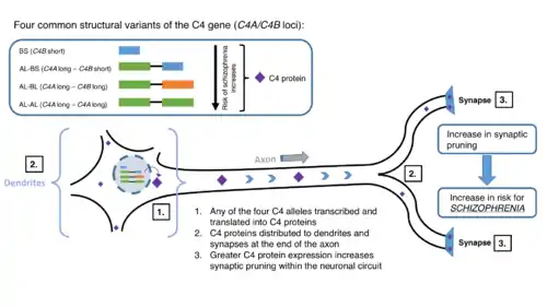 Data and information collected internationally can shed light onto the mysteries of schizophrenia. Sekar et al. analyzed single nucleotide polymorphisms (SNP) of 40 cohorts in 22 countries, in total adding up to nearly 29,000 cases.[1] They found out two features: 1) A great number of SNPs reaching only 2Mb across the end, 2) peak of association centered at C4, predicting that C4A expression levels is most strongly correlated with schizophrenia.[1] In addition, they have discovered a mechanism by which schizophrenia could arise from the genetic predisposition of the human complement C4.[1] As shown in Figure 1, four common structural variations discovered in genome-wide association studies (GWAS) studies have pointed to the high turnout of schizophrenia.[1] Possibly, the higher levels of expression of C4 protein due to pattern of variants of the C4 gene, allows for the unwanted increase in synaptic pruning (an effect produced by the effector proteins of the complement system in which the C4 partakes).