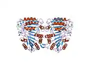 Caspase-9 belongs to a family of caspases, cysteine-aspartic proteases involved in apoptosis and cytokine signalling.[8] Apoptotic signals cause the release of cytochrome c from mitochondria and activation of apaf-1 (apoptosome), which then cleaves the pro-enzyme of caspase-9 into the active dimer form.[6] Regulation of this enzyme occurs through phosphorylation by an allosteric inhibitor, inhibiting dimerization and inducing a conformational change.[8]