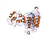 Caspase-9 is an enzyme that in humans is encoded by the CASP9 gene. It is an initiator caspase,[5] critical to the apoptotic pathway found in many tissues.[6] Caspase-9 homologs have been identified in all mammals for which they are known to exist, such as Mus musculus and Pan troglodytes.[7]