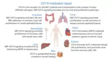 CD74 receptor is expressed on the surface of different cell types. Interaction between MIF cytokine and its cell membrane receptor CD74 activates pro-survival and proliferative pathways that protect against injury and promote healing in different parts of the body.[22]