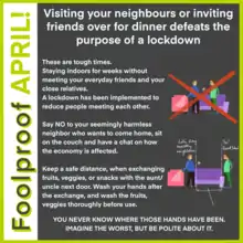 The Janata Curfew (transl.People's curfew) was a 14-hour curfew on 22 March (from 7 a.m. to 9 p.m.).[26] Every person was required to obey the curfew, with exceptions for people of "essential services" such as police, medical services, media, home delivery professionals and firefighters. At 5 p.m. that day, all citizens were asked to stand in their doorways, balconies or windows, and clap their hands or ring their bells in appreciation for the professionals delivering these essential services.[27] People belonging to National Cadet Corps and National Service Scheme were to enforce the curfew in the country.[28] The Prime Minister also urged the youth to inform 10 others about Janata Curfew and encourage everyone to observe the curfew.[28]
