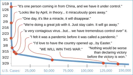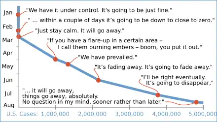 - · Walters, Joanna; Wong, Julia Carrie (August 5, 2020). "Trump again claims Covid-19 will 'go away' as Fauci warns of long road ahead". The Guardian. Archived from the original on August 6, 2020. · Walters and Wong cite Pilkington, Ed (July 26, 2020). "Six months of Trump's Covid denials: 'It'll go away … It's fading'". The Guardian. Archived from the original on August 4, 2020. · Most case data was explicit in the Guardian articles; three data items for the chart were obtained from CDC data at "Coronavirus Disease 2019 (COVID-19) / Cases in the U.S. / New Cases by Day / View Data". cdc.gov. Centers for Disease Control and Prevention. Archived from the original on August 6, 2020.
