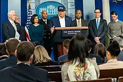 On 2 March, Trump told the media he had heard that a COVID-19 vaccine would be available in "a matter of months", with "a year [being] an outside number", after Trump attended a discussion where his senior health official Anthony Fauci told him this process would take "a year to a year and a half" (at a minimum, Fauci later said). During that discussion, Trump repeatedly quizzed the leaders of pharmaceutical companies on the time needed to produce vaccines, stating "I like the sound of a couple of months better".[28] The length of time is due in part to regulations and safeguards intended to guarantee efficacy and safety.[29] On 4 March, Trump blamed the Barack Obama administration for making "a decision" that delayed COVID-19 testing by the Trump administration. The policy in question had never been modified by the Obama administration, despite plans to do so. The policy's overall legal roots date to 2004, before the Obama administration. Under the umbrella of Emergency Use Authorizations, the old policy stated that laboratory-developed tests "should not be used for clinical diagnoses without FDA's approval, clearance, or authorization during an emergency declaration". However, this policy was historically treated as a recommendation and generally unenforced, with no clear legal authority of the FDA in this area. The Trump administration continued to require laboratories to apply to the FDA for approval, but allowed the laboratories to test while the FDA processed the applications.[30]