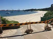 Interstate border closures began on 19 March, with Tasmania imposing a mandatory 14-day quarantine on all "non-essential" travellers to the state, including returning residents.[65] On 24 March, Western Australia, South Australia and the Northern Territory closed their borders, with all interstate arrivals being required to self-isolate for 14 days.[66] On 11 April, Queensland banned interstate arrivals, with only Queensland residents and those granted 'exemption' being allowed entry.[67] On 8 July, the Victorian and NSW governments, jointly closed their common border, following a large spike in cases in parts of Melbourne.