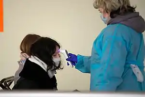On 11 April 2020, during a press-conference concluding a three-day WHO inspection, the leader of the WHO mission in Belarus, Patrick O'Connor, noted the "systematic approach", presence of the testing laboratories, patient segregation (as a means of stopping the spread of the infection in hospitals) and the quickly organized domestic production of the protective equipment for medics as positives of the Belarusian response to the pandemic. The WHO recommendations included physical distancing (cancelling of the sports and cultural events, implementation of remote education and minimization of the nonessential movements for the high-risk groups of people), improvements of the testing process and isolation of the first- and second-level contacts. According to O'Connor, Belarus was stepping in a new phase of the pandemic with the transmission of the disease occurring on the "community level".[101]