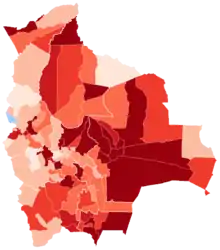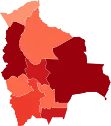 The COVID-19 pandemic in Bolivia is part of the worldwide pandemic of coronavirus disease 2019 (COVID-19) caused by severe acute respiratory syndrome coronavirus 2 (SARS-CoV-2). The virus was confirmed to have spread to Bolivia on 10 March 2020, when its first two cases were confirmed in the departments of Oruro and Santa Cruz.[1][2]