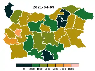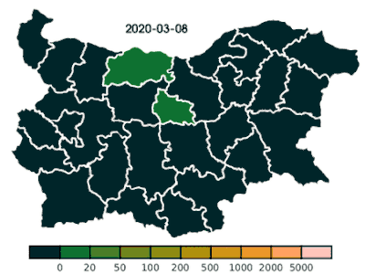 The total number of cases reached 331, an increase of 38 from the previous day. The new cases included 19 in Sofia, 5 in Blagoevgrad, 4 in Burgas, 3 in Varna, 2 each in Kardzhali, Plovdiv and Shumen, and 1 in Smolyan. Four new deaths were also reported, with two occurring in Blagoevgrad and one each in Kyustendil and Sofia.[39] The cases in Blagoevgrad, a mother and her daughter, were initially refused admission to the local hospital despite visible symptoms and had to request testing at a private lab; by the time the results came out as positive, the patients' condition had deteriorated significantly. They were eventually admitted and sent to intensive care, but both died shortly after.[40]