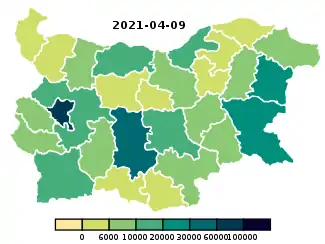 As of 1 February 2021, there are 218,748 officially confirmed cases spread throughout all Bulgarian provinces, with 9,045 recorded deaths and 187,052 recoveries. A total of 1,391,560 PCR tests (or 201,163 per million citizens) had been performed by 1 February, with 15.71% being positive.[7]