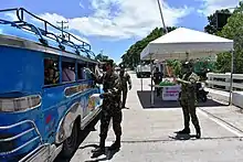 Due to the increase of cases in Cebu despite the ECQ, tougher measures were enacted. One June 22, President Duterte ordered Roy Cimatu, Secretary of the Department of Environment and Natural Resources, to lead and oversee the COVID-19 response.[50][51] Backed by soldiers of the Philippine Army, operatives from the Philippine National Police's Special Action Force, and armored vehicles, patrols were made in areas where there were numerous cases or reported quarantine violators such as Barangay Luz, Barangay Alaska Mambaling, Barangay Calamba, and Barangay San Nicholas.[52] IATF officials also conducted aerial surveys of Cebu City in conjunction with the Philippine Air Force.[53][54]
