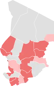 As a preventive measure, the government cancelled all flights into the country, except for cargo flights.[31][32] Furthermore, the government responded with similar and standard global practices of mandating mask wearing in public spaces, creating a curfew from 8 pm to 5 am, checking temperatures at airports and supporting "quarantine hotels", as well raising public awareness of the viral threat through campaigns and advertisements. Schools, public life such as bars and social clubs, and government work was closed along with social distancing requirements.[33] Of importance to note is the paradox of low corona virus cases in Chad given the strained health systems in place. Researches have theorized that these low numbers may have a multitude of answers: notably the population's previous exposure and experience with infectious disease, as well the average age of the population, 52.8 years, being under the highest levels of "at-risk ages" for the COVID-19 pandemic, around 65 years old and poor records and/or testing of cases.[34] The IMF details responses the Chadian government has worked to implement such as subsidizing the agricultural sector, tax break plans, focusing on essential imports such as food distribution, suspending household bills, and clearing domestic debt.[33] Of importance to track in response to the pandemic is Chad's increasing ties with China. China has a relationship with the nation through generous loan programs, and throughout the pandemic these ties have increased as China has stepped up to provide food distribution aid as well as medical equipment and support in zones of active violence in Chad.[35]