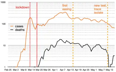 Denmark was among the first European countries to introduce lockdown measures, starting on 13 March.[4][5] Following a period of consistent increase in hospitalisations, the number of people in hospital with COVID-19 has been falling since late March, with the number of cases in need of intensive care and ventilator units (also at the peak in late March)[6] being well below available resources.[7] Starting on 15 April, a very slow and gradual reopening has been initiated, but if there are indications that the number of infections increases too fast, it will be reversed.[8]