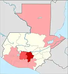 ![]() 1-9 Cases Reported 10-99 Cases Reported 100-999 Cases Reported +1000 Cases Reported Cases by department (April 12), this was the last day the government issued a case report by department. From this date onwards cases were reported by region. Since May 11, cases have been reported on all Guatemalan departments[1] | |