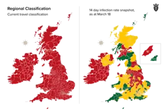 On 19 March, the Government announced the reconnection strategy for travel. The island will return to regional classifications on the Green/Amber/Red framework from 26 April. From 17 May, all countries will move from all-red to regional classifications except those on the UK "red list" of travel banned countries.[60]